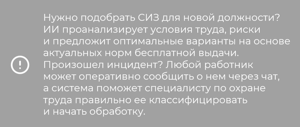 Например, при проведении идентификации опасностей на рабочем месте на основе запроса пользователя, который содержит информацию об особенностях выполнения работ, ИИ может представить перечень и описание опасностей, характерных для данного рабочего места.