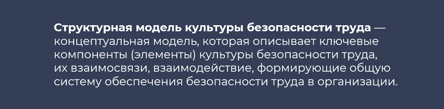 Если модель зрелости описывает уровни развития «по вертикали», то структурная модель — внутреннее устройство культуры безопасности «по горизонтали», выделяя ее ключевые компоненты и их взаимосвязи. Такая модель представляет собой системный подход, рассматривающий культуру безопасности не как набор разрозненных мер, а как целостную динамичную систему. Она служит детальной картой для диагностики, позволяя выявлять «слабые звенья» и целенаправленно развивать отдельные элементы.