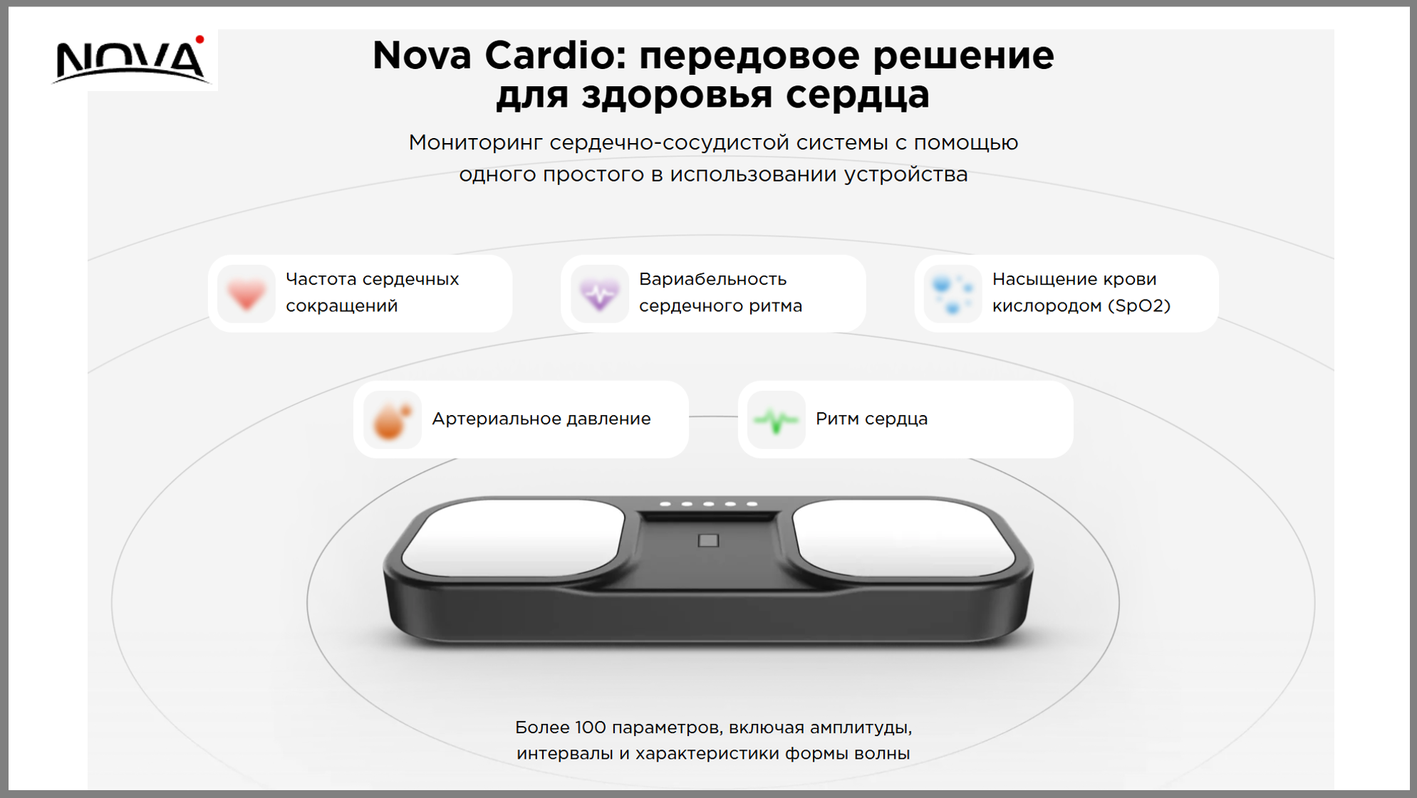 Примером комплексного решения является устройство Nova Cardio. Гаджет объединяет в себе функции тонометра, электрокардиографа и пульсоксиметра. Каждое измерение прибора представляет собой 30-секундную запись ЭКГ (электрокардиограммы) и ФПГ (фотоплетизмограммы), обработанную и разделенную на сердечные циклы, возможные амплитуды и интервалы, которые определяются и сравниваются с медицинскими нормами.
