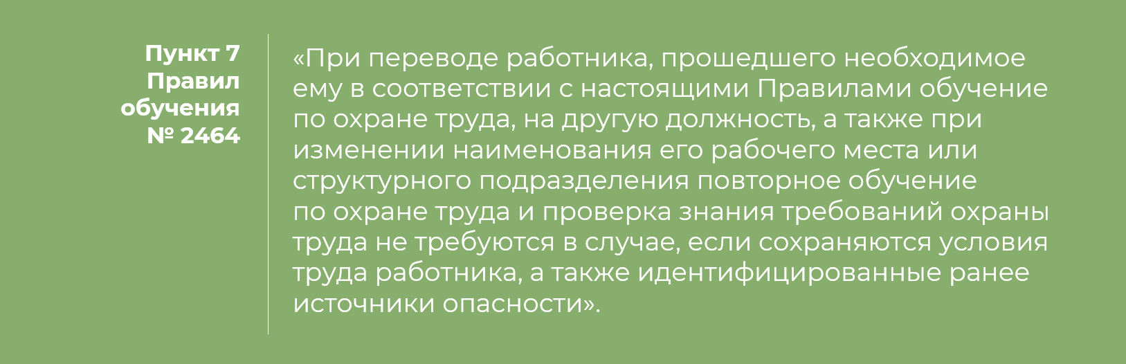 Нормы пункта 7 Правил обучения № 2464 освобождают от повторного обучения и проверки знания требований охраны труда при переводе работника на другую должность, если сохраняются условия труда и идентифицированные ранее источники опасности. Однако прямое указание на внутреннее совместительство (заключение нового трудового договора на иные обязанности у того же работодателя) отсутствует. Это на практике могло приводить к разночтениям.