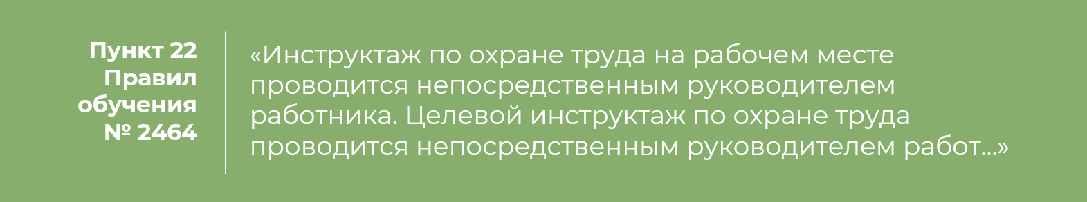 Нормами пункта 22 Правил обучения № 2464 установлено, что инструктаж по охране труда на рабочем месте проводит непосредственный руководитель работника. Например, для генерального директора организации, у которого нет вышестоящего руководителя, данная норма может создавать процедурные сложности.