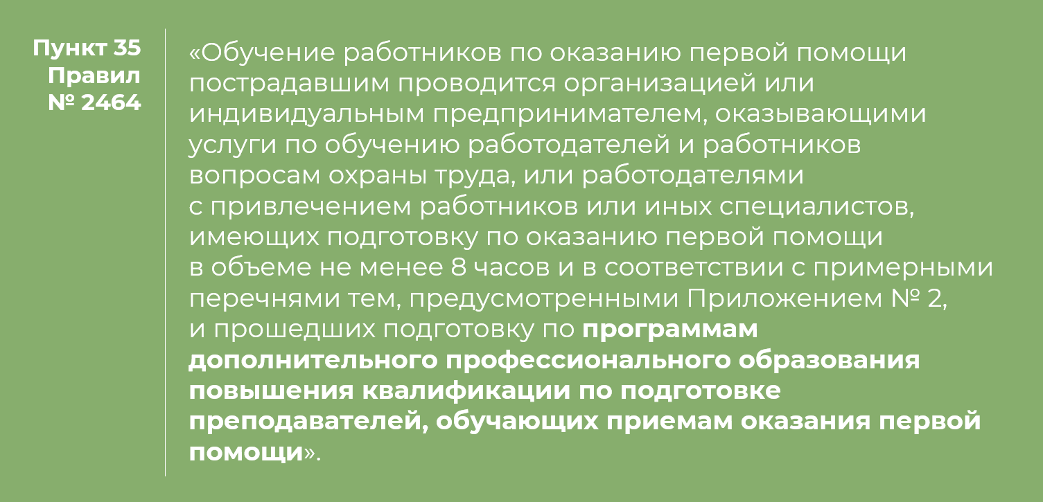 Нормами пункта 35 Правил обучения № 2464 установлено требование о том, что лица, проводящие обучение работников по оказанию первой помощи пострадавшим, должны пройти повышение квалификации по программам подготовки преподавателей, обучающих приемам оказания первой помощи.