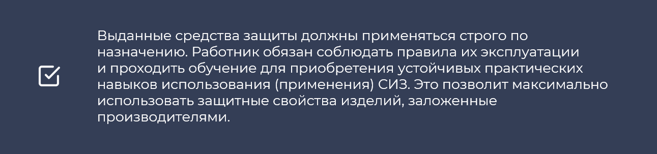 В соответствии с нормами пункта 12 Правил обеспечения работников средствами индивидуальной защиты и смывающими средствами, утвержденных Приказом Минтруда России от 29 октября 2021 года № 766н, на работника возлагается обязанность по целевому использованию выданных СИЗ и соблюдению правил их эксплуатации. Он должен проводить предварительный осмотр средств защиты для оценки их исправности, комплектности и пригодности к работе, а также немедленно информировать работодателя о выявленных дефектах, загрязнениях или утрате защитных свойств изделий.
