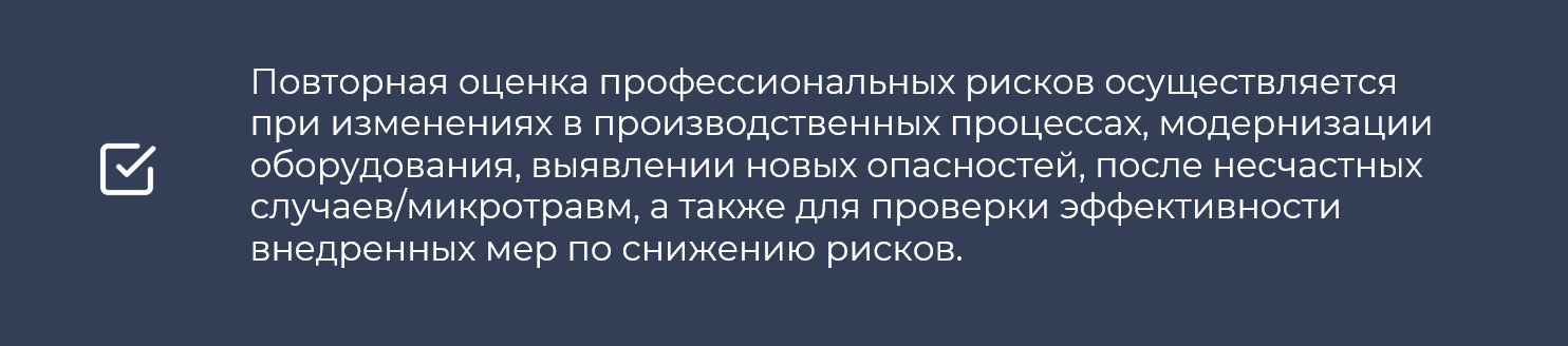 IV) проводится повторная оценка уровня профессиональных рисков после реализации указанных в предыдущем шаге мероприятий.