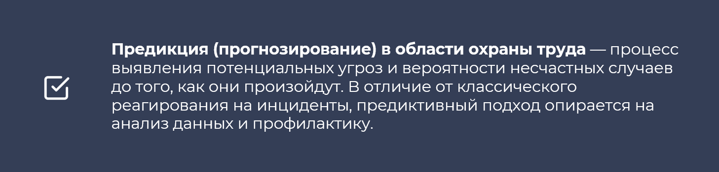 Если устоявшийся подход следует схеме «несчастный случай → расследование → наказание», то предиктивный подход предполагает, что система видит накопление критических факторов (например, усталости работника в течение смены в сочетании с неисправностью оборудования) и инициирует остановку работ или реализацию мер безопасности до возникновения самого инцидента. Предикция — это не юридическое предписание об устранении уже найденного нарушения, а работа с математической вероятностью будущих событий.
