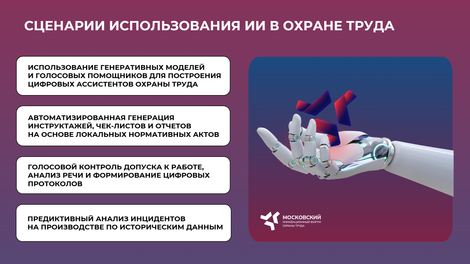 Одна из ключевых тем МИФОТ-26 — применение цифровых ассистентов и голосовых помощников, созданных на базе генеративного ИИ. Эти технологии трансформируют охрану труда, превращая трудоемкий «бумажный» процесс в проактивную цифровую среду обеспечения профессиональной безопасности работников.