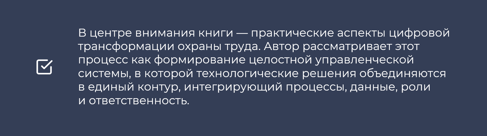 Переход на данный онлайн-ресурс позволяет использовать инструменты в реальных проектах, адаптировать их в соответствии с рабочими процессами, применять материалы как основу для внутренних стандартов и получать обновленные версии по мере развития практики. Книга и веб-ресурс вместе образуют единый прикладной контур, предназначенный для реальных проектов цифровой трансформации охраны труда.