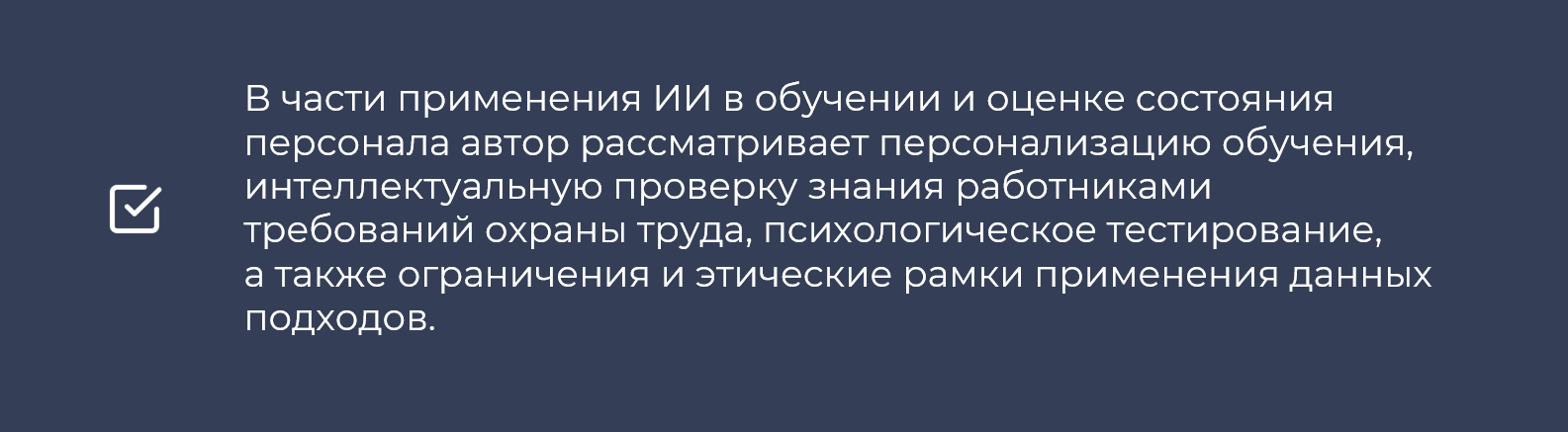 В заключительной части главы представлен обзор ограничений технологий и типовых ошибок внедрения. Несмотря на высокий технологический потенциал, ИИ в охране труда не является универсальным решением и при некорректном применении способен не только не снизить риски, но и усугубить их. Осознание границ применимости ИИ является признаком зрелости культуры безопасности труда и необходимым условием устойчивой цифровой трансформации.