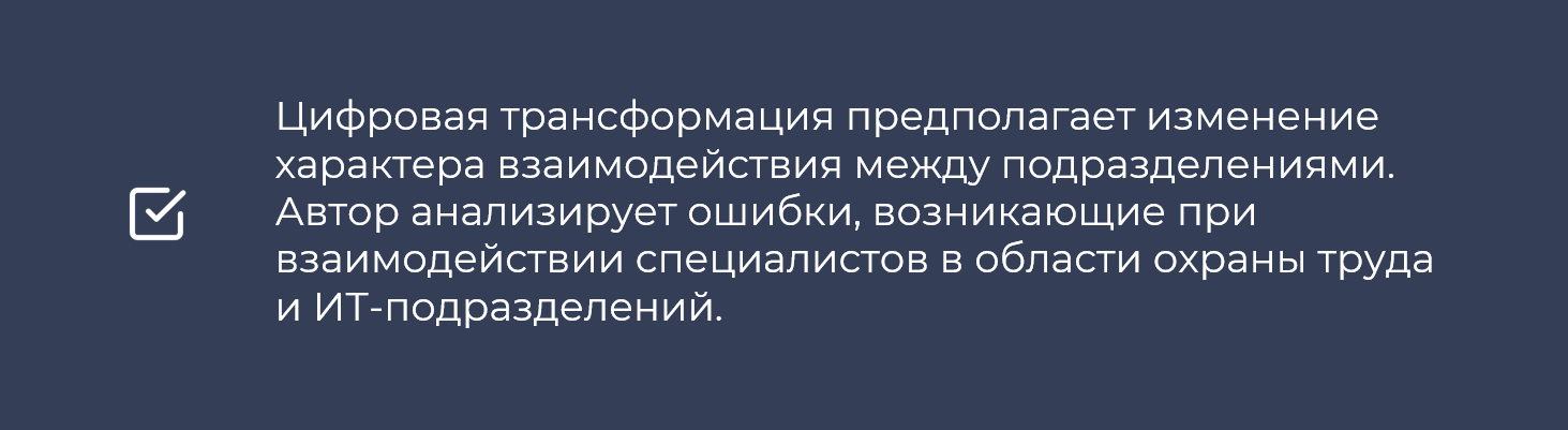 Практика показывает, что попытки начать цифровую трансформацию охраны труда исключительно с внедрения технологий без изменения управленческой модели приводят к ограниченным результатам. Например, внедрение системы мониторинга условий труда может обеспечить регулярное получение измерений, но, если эти данные не используются для корректировки организации работ или принятия управленческих решений, они остаются формальным приложением к отчетности. Аналогично, цифровые журналы и электронные отчеты упрощают документооборот, но не влияют на уровень риска, если сама логика управления остается реактивной.