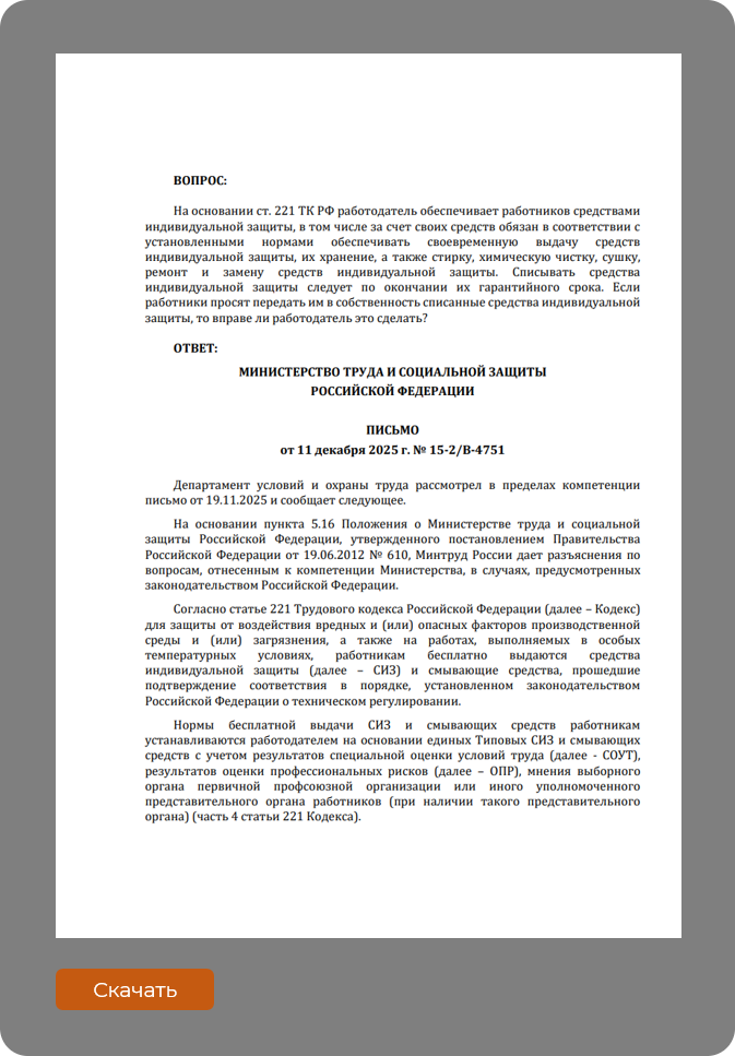 В Письме от 11 декабря 2025 года № 15-2/В-4751 эксперты Минтруда России разъяснили, что в соответствии со статьей 221 ТК РФ и Правилами обеспечения работников СИЗ, утвержденными Приказом Минтруда России от 29 октября 2021 года № 766н, работодатель обязан организовать учет и контроль за выдачей средств защиты, а также за своевременным возвратом данных изделий по истечении нормативного срока их эксплуатации. Работник, в свою очередь, обязан вернуть работодателю СИЗ после окончания срока их использования, за исключением изделий однократного применения и дерматологических средств.
