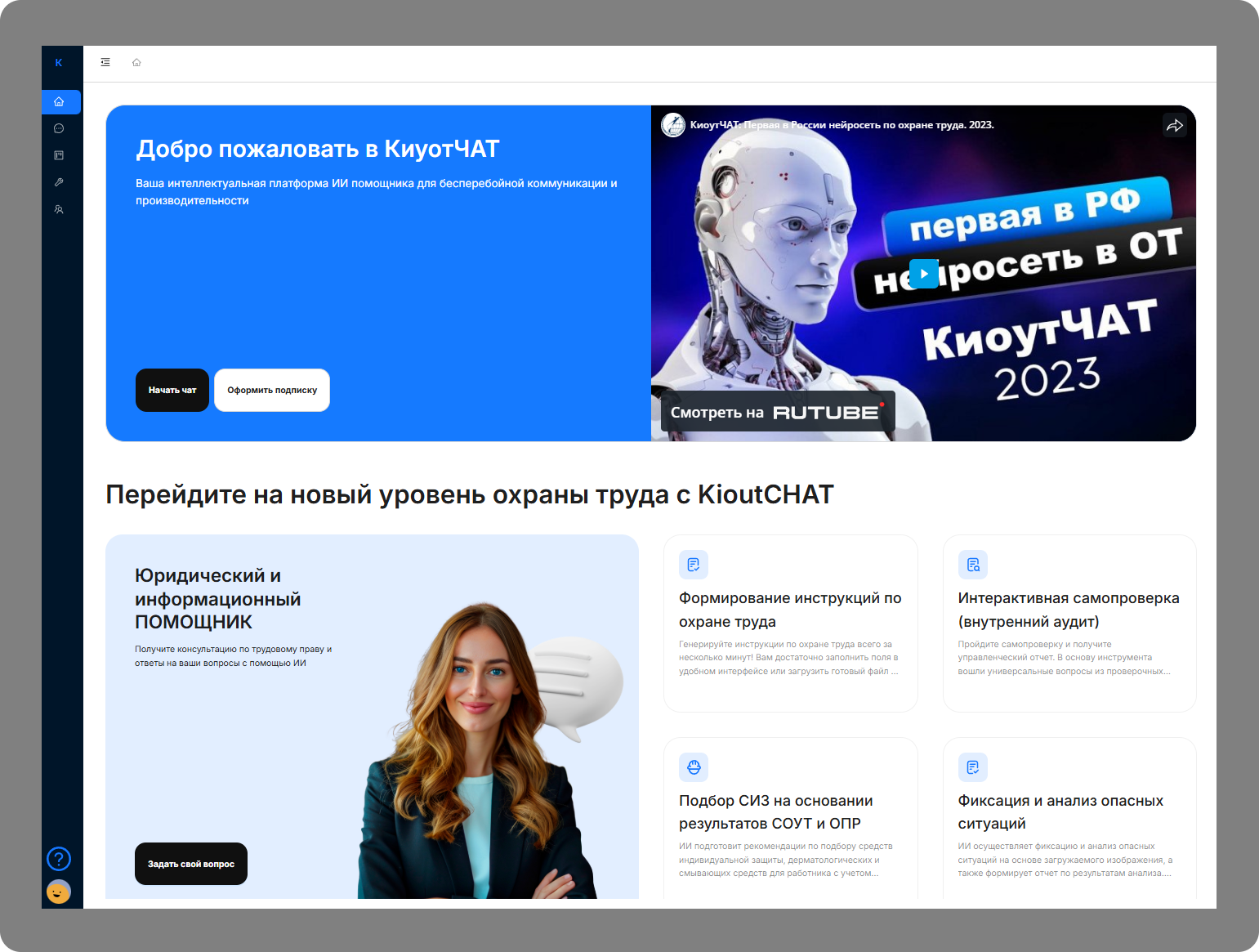 Сегодня специалист в области охраны труда не просто выполняет контрольную функцию, а помогает создавать безопасную рабочую среду, где технологии работают на благо людей. Бумажный документооборот уступает место цифровым решениям, которые анализируют, подсказывают и делают процессы прозрачными. Именно поэтому все больше профессионалов выбирают AI-чат-бот KioutCHAT на базе искусственного интеллекта (далее — ИИ) — не для замены человека, а в качестве надежного партнера, который делает работу проще, точнее и спокойнее.