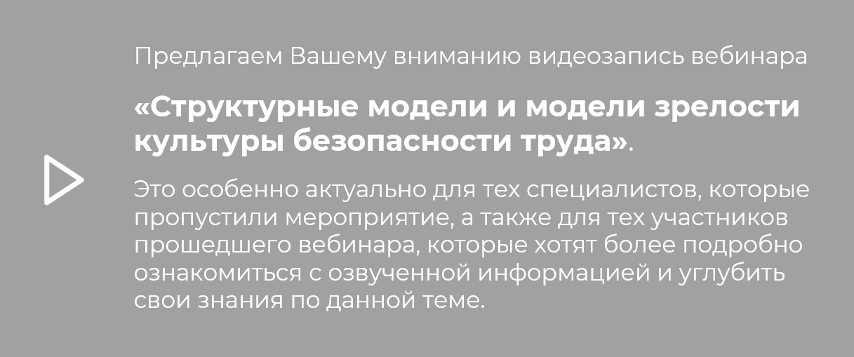 Участники вебинара получили представление о структурных моделях культуры безопасности труда, которые принципиально отличаются от описанных выше моделей зрелости.