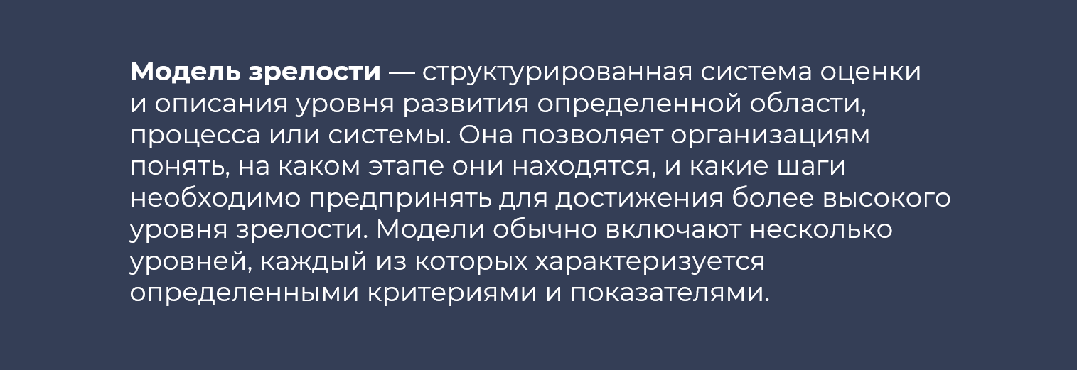 Модель зрелости культуры безопасности описывает ключевые атрибуты организации для каждого уровня развития. Она является универсальным инструментом для оценки и совершенствования. Оценка проводится с использованием анкет, интервью, фокус-групп, аудита. Модель часто визуализируется в виде матрицы зрелости, где для каждого уровня дано описание характеристик.