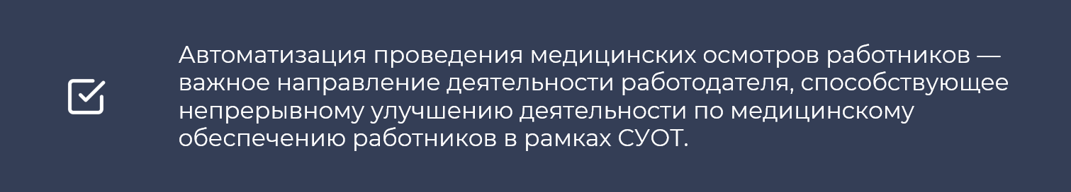 Современные системы дистанционного медицинского контроля, например, Медикон, СТРАЖ и КОДОС, позволяют проводить обязательные осмотры работников непосредственно на рабочих местах.