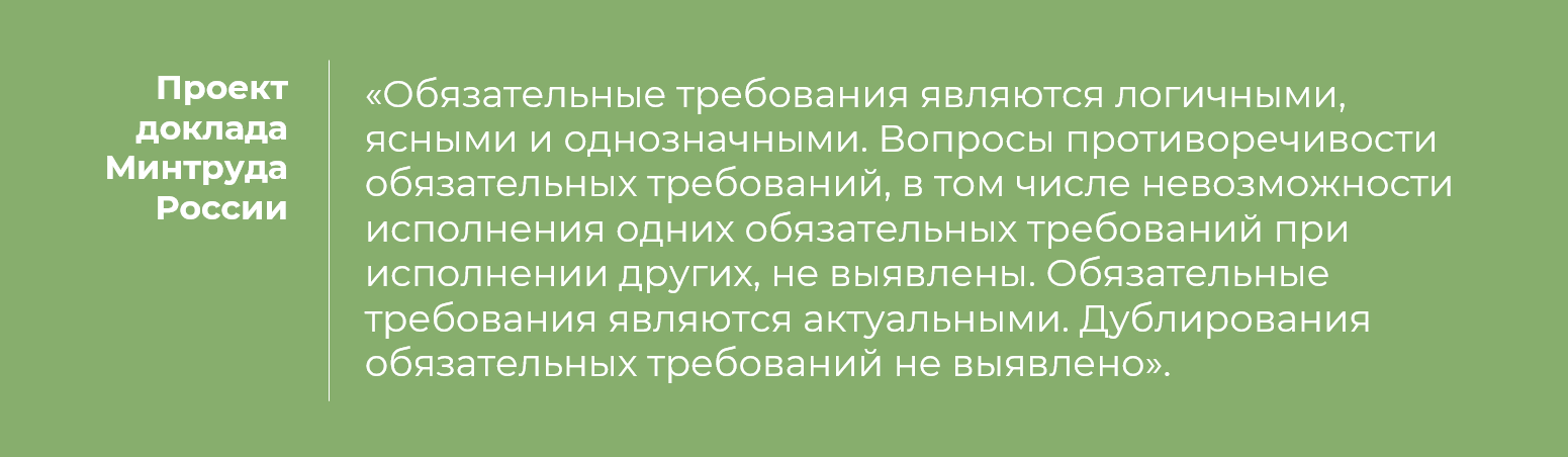Как следует из Проекта доклада Минтруда России, подготовленного по итогам проведенной оценки правоприменительной практики, основания для комплексного пересмотра действующей системы обязательных требований в сфере обучения по охране труда отсутствуют. Действующие нормы оцениваются как логичные, ясные, однозначные, актуальные и лишенные противоречий или дублирования.