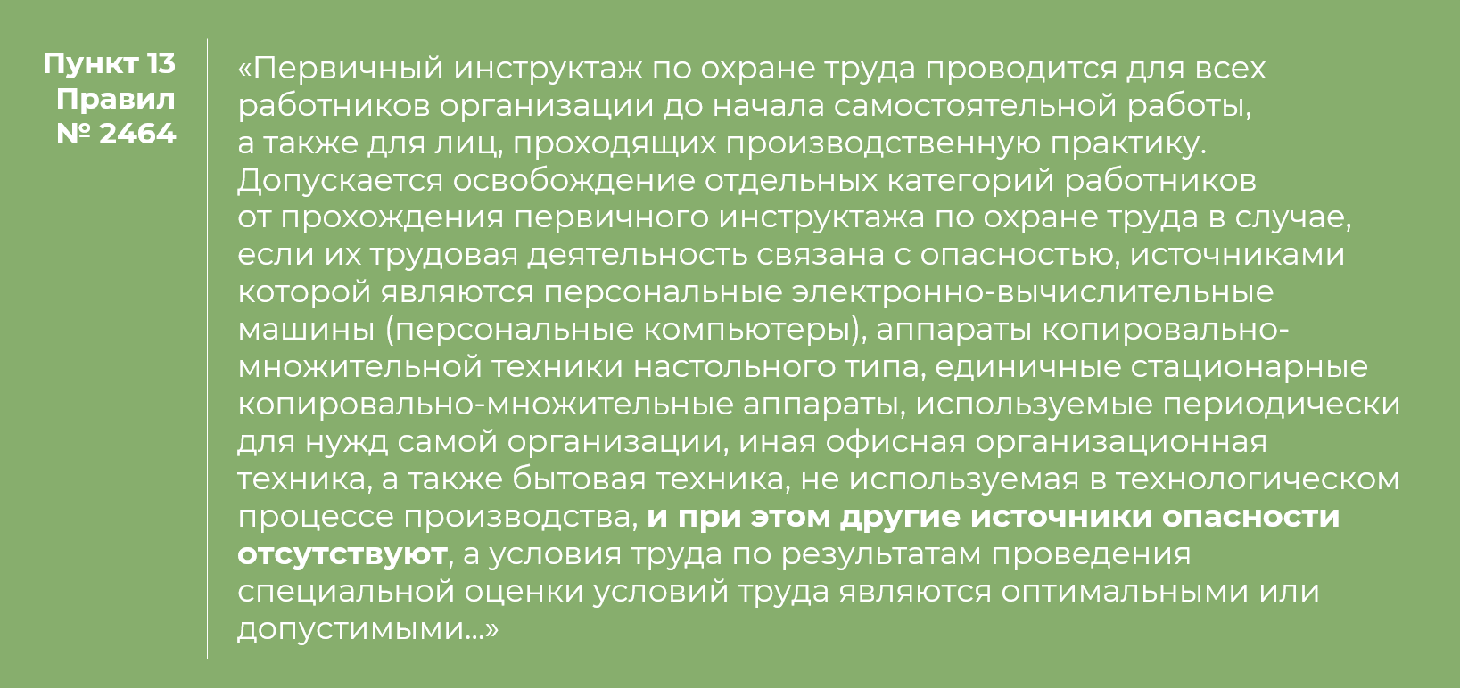 Действующие нормы пункта 13 Правил обучения № 2464 допускают освобождение от первичного инструктажа работников, чья деятельность связана с опасностью, источниками которой является компьютерная и иная офисная техника «… и при этом другие источники опасности отсутствуют, а условия труда по результатам проведения специальной оценки условий труда являются оптимальными или допустимыми…» (далее — СОУТ).