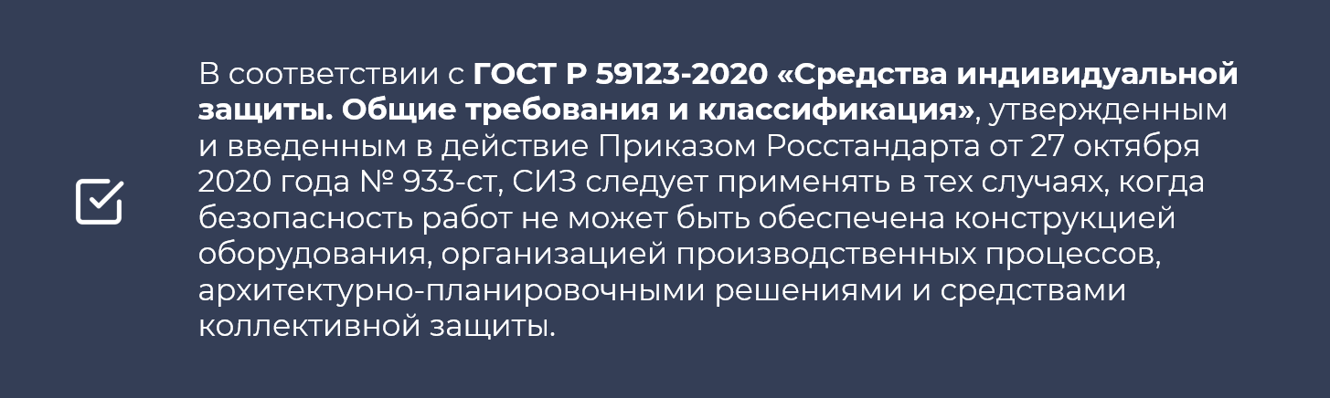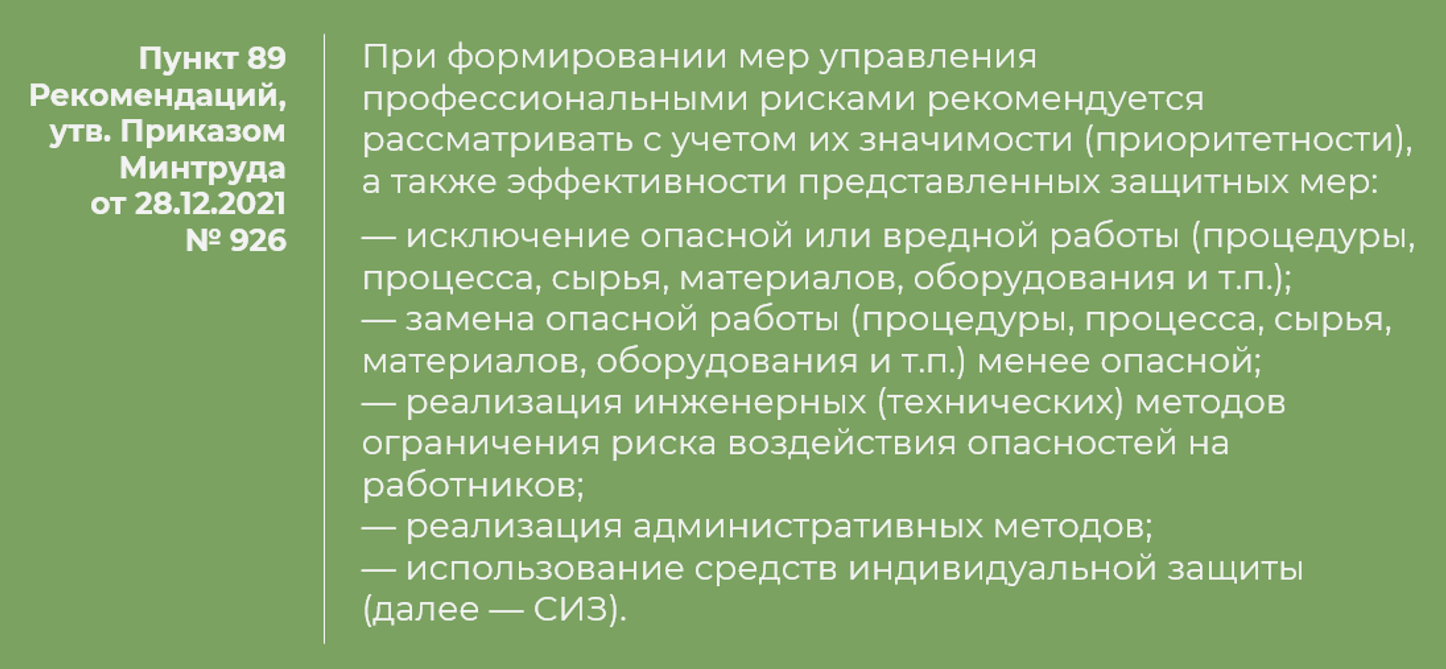 В соответствии с нормами пункта 89.5 Рекомендаций № 926 применение СИЗ является завершающей мерой в иерархии управления профессиональными рисками, которая осуществляется в случаях, когда исчерпаны возможности устранения опасности, инженерных и административных методов управления, а также СКЗ. Обеспечение работников СИЗ осуществляется работодателем на основании Единых типовых норм выдачи средств индивидуальной защиты и смывающих средств, утвержденных Приказом Минтруда России от 29 октября 2021 года № 767н, с учетом результатов специальной оценки условий труда и оценки профессиональных рисков.