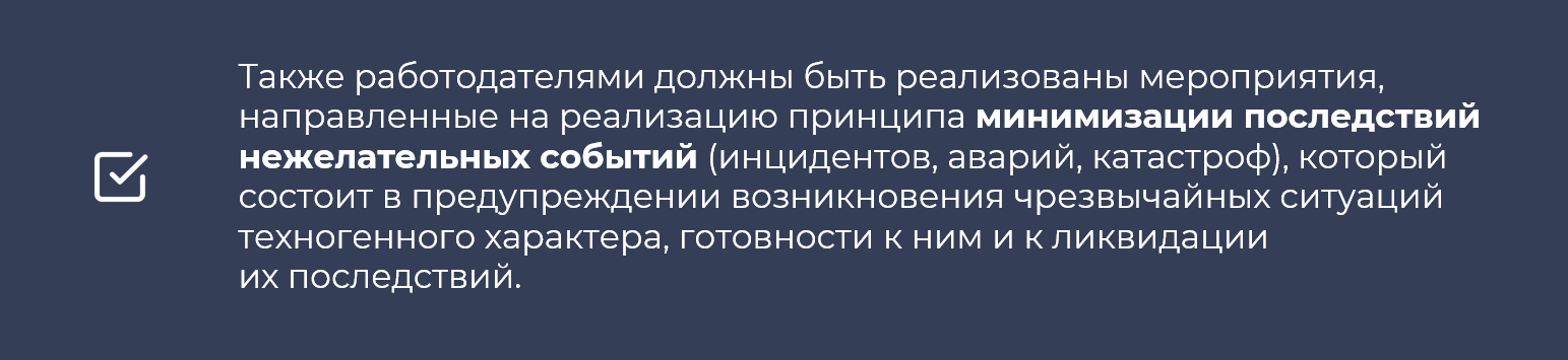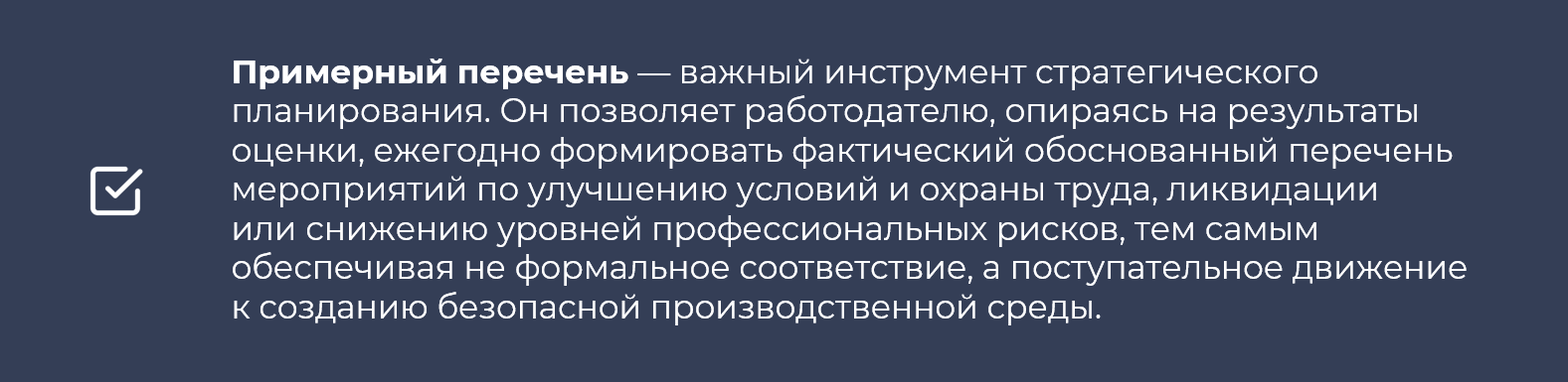 Одновременно перечень отражает необходимость создания инфраструктуры, направленной на снижение производственного травматизма и профессиональной заболеваемости, обеспечения работников СИЗ и смывающими средствами, организации санитарно-бытовых помещений, комнат психологической разгрузки, пунктов оказания первой помощи и так далее.