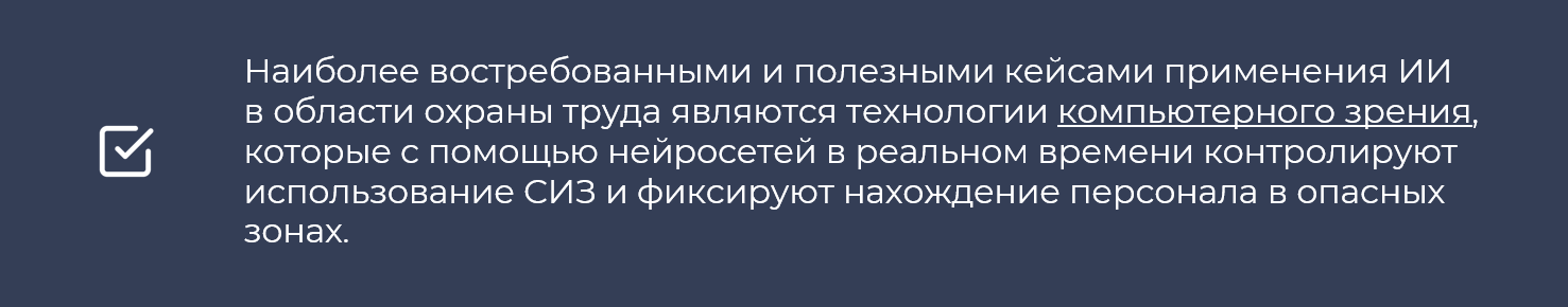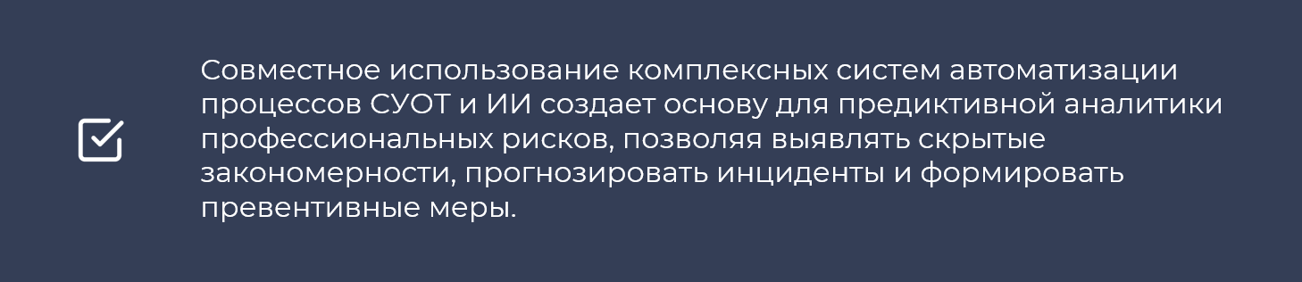 Применение ИИ позволяет выстраивать процессы в рамках СУОТ таким образом, чтобы они были максимально прозрачными, функциональными и эффективными. ИИ играет ключевую роль в создании безопасной рабочей среды. Применение предиктивного анализа и разработка проактивных мероприятий позволяет компаниям оптимизировать расходы на охрану труда, снижать риски травмирования работников и возникновения профессиональных заболеваний. Интеграция экспертных знаний и ИТ-технологий способствует повышению качества и эффективности работы, направленной на обеспечение профессиональной безопасности, сохранение жизни и здоровья работников.