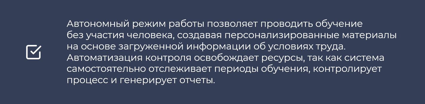 Учебные материалы и задания формируются ИИ на основании данных о работнике и его рабочем месте, а также действующих нормативных правовых и локальных нормативных актов. Они направляются работнику автоматически с установленной периодичностью, которая зависит от графика работы. Пользователю предоставляется индивидуальный доступ к системе.