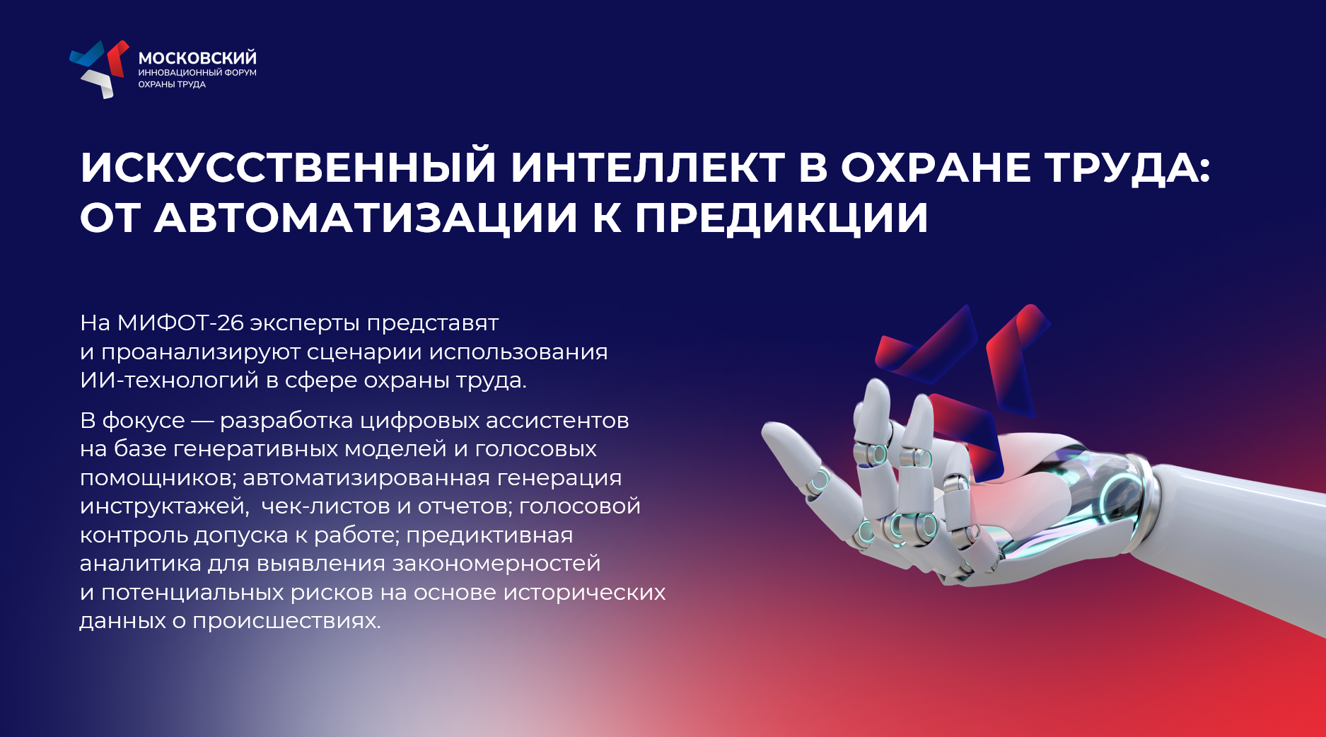 Один из ключевых тематических блоков предстоящего форума МИФОТ-26 — «ИИ в охране труда: от автоматизации к предикции». На площадке инновационного центра «Сколково» эксперты представят и детально обсудят возможные сценарии применения ИИ-технологий в области охраны труда.