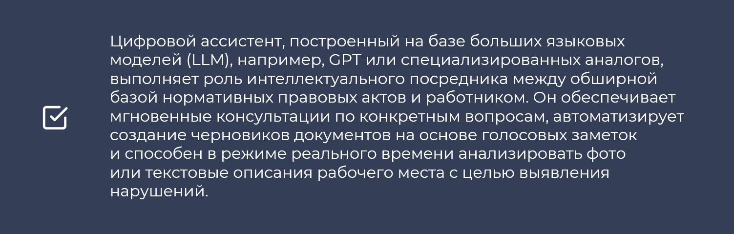 Одна из ключевых тем МИФОТ-26 — применение цифровых ассистентов и голосовых помощников, созданных на базе генеративного ИИ. Эти технологии трансформируют охрану труда, превращая трудоемкий «бумажный» процесс в проактивную цифровую среду обеспечения профессиональной безопасности работников.
