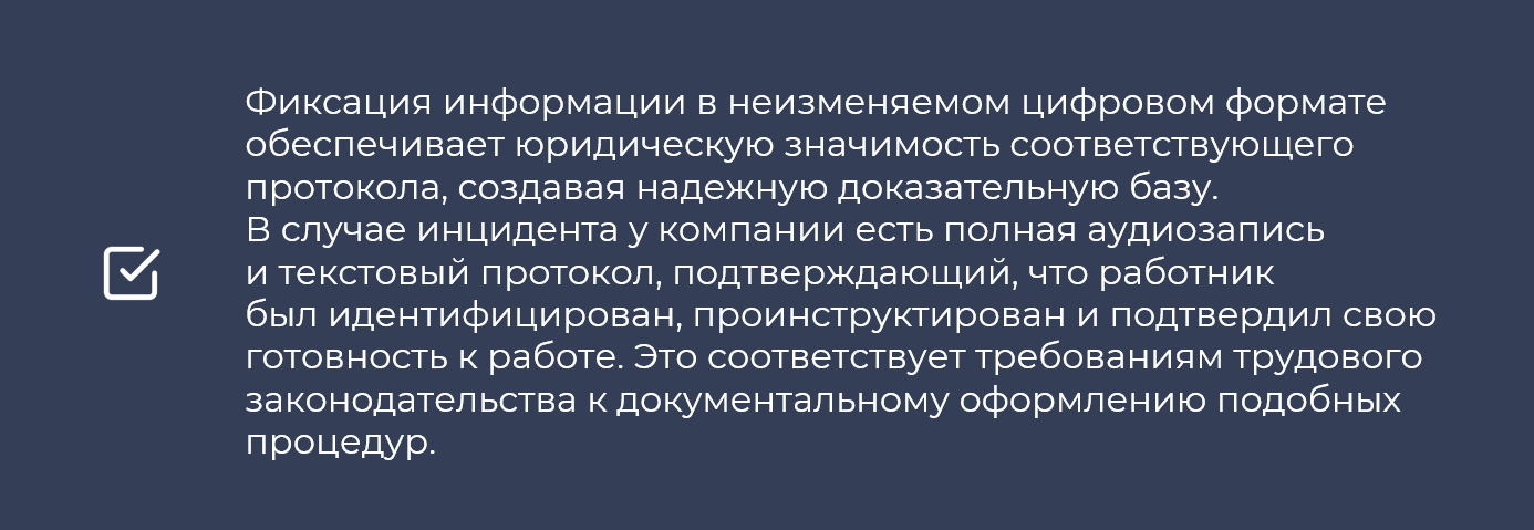 Таким образом, внедрение ИИ-систем голосового анализа обеспечивает превентивное выявление отклонений в состоянии здоровья, препятствующих безопасному выполнению работ, и повышает персональную ответственность работника. Также формируется объективная доказательная база для работодателя и создается массив данных для глубинного анализа причин инцидентов и совершенствования СУОТ.