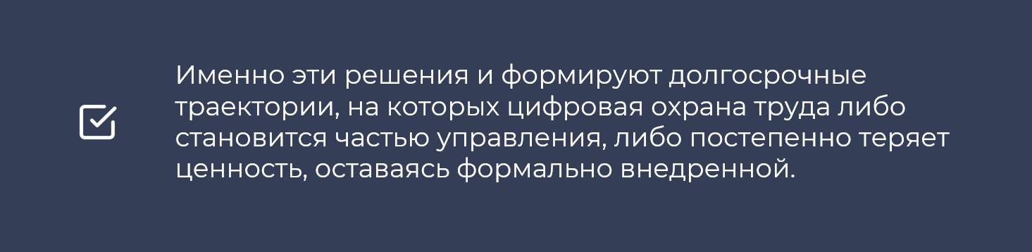Грамотно выстроенная дорожная карта позволяет системе развиваться, когда каждый следующий шаг усиливает предыдущий: данные начинают поддерживать процессы, процессы — управленческие решения, а решения — культуру профилактики риска. Без этого цифровая охрана труда остается набором несвязанных инициатив, не меняющих сути управления безопасностью труда.