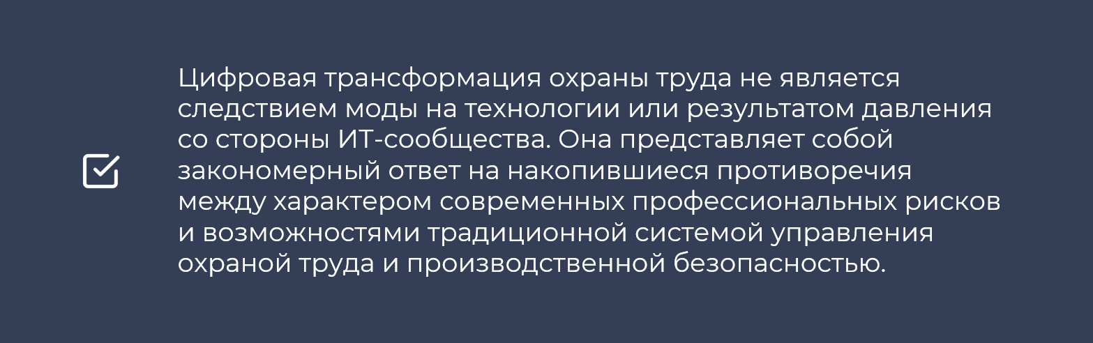 Практика показывает, что попытки начать цифровую трансформацию охраны труда исключительно с внедрения технологий без изменения управленческой модели приводят к ограниченным результатам. Например, внедрение системы мониторинга условий труда может обеспечить регулярное получение измерений, но, если эти данные не используются для корректировки организации работ или принятия управленческих решений, они остаются формальным приложением к отчетности. Аналогично, цифровые журналы и электронные отчеты упрощают документооборот, но не влияют на уровень риска, если сама логика управления остается реактивной.