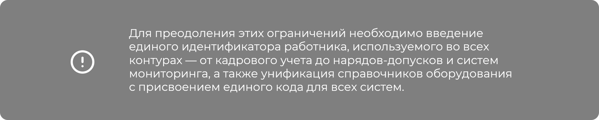 В различных системах автоматизации один и тот же работник или единица оборудования могут иметь разные идентификаторы. Отсутствие единой системы учета не позволяет установить, какие именно работники участвовали в выполнении технологических операций на конкретном оборудовании, какие средства защиты были им выданы, а также какие мероприятия были реализованы для допуска к работам. Это затрудняет как анализ происшествий, так и перспективное планирование мероприятий, направленных на снижение рисков.