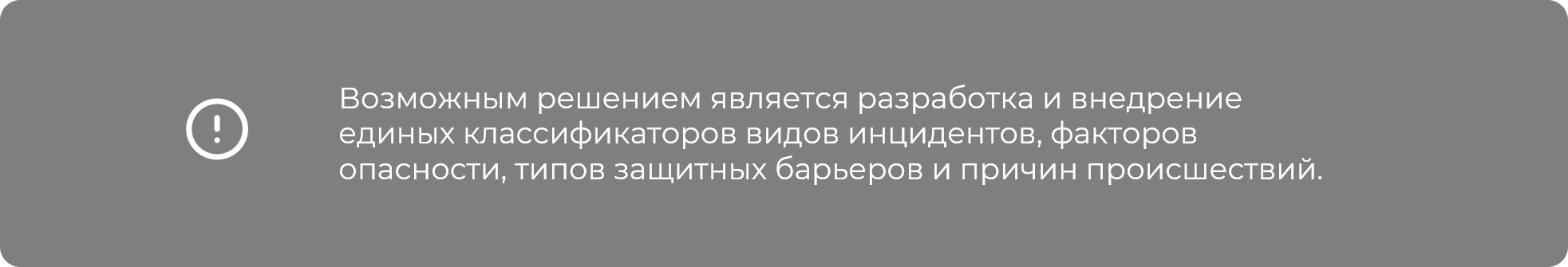 Классификаторы видов инцидентов, опасных факторов, а также средств защиты, организационных процедур и поведенческих практик, являющихся защитными барьерами от воздействия факторов риска, часто бывают не согласованы между подразделениями и отдельными производственными участками организации. Из-за этого становится невозможным установление причинно-следственных связей между техническими отказами и сопутствующим травмированием работников, поскольку технически событие фиксируется в одной системе с использованием определенного классификатора, а факт травмы — в другой системе с применением иных справочников.