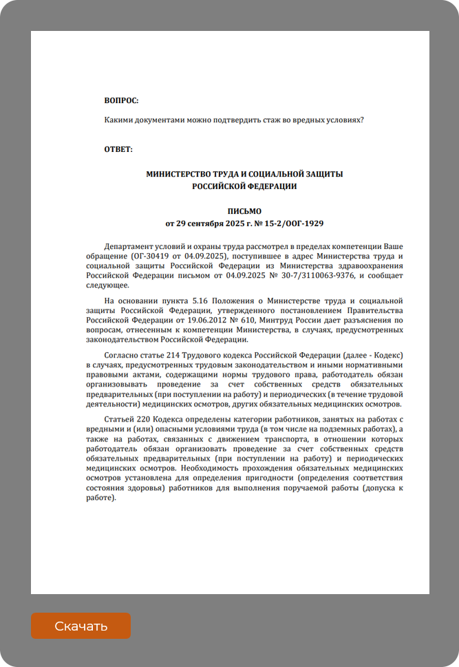 В связи с этим именно работодатель располагает всей необходимой документацией, включая кадровые приказы, табели учета рабочего времени и личные карточки, которые могут подтвердить периоды работы персонала во вредных условиях труда в конкретной организации. Вопросы же, касающиеся медицинских аспектов, в том числе разъяснения порядка проведения медицинских осмотров и периодичности направления в центр профпатологии, авторами разъяснений отнесены к компетенции Минздрава России.