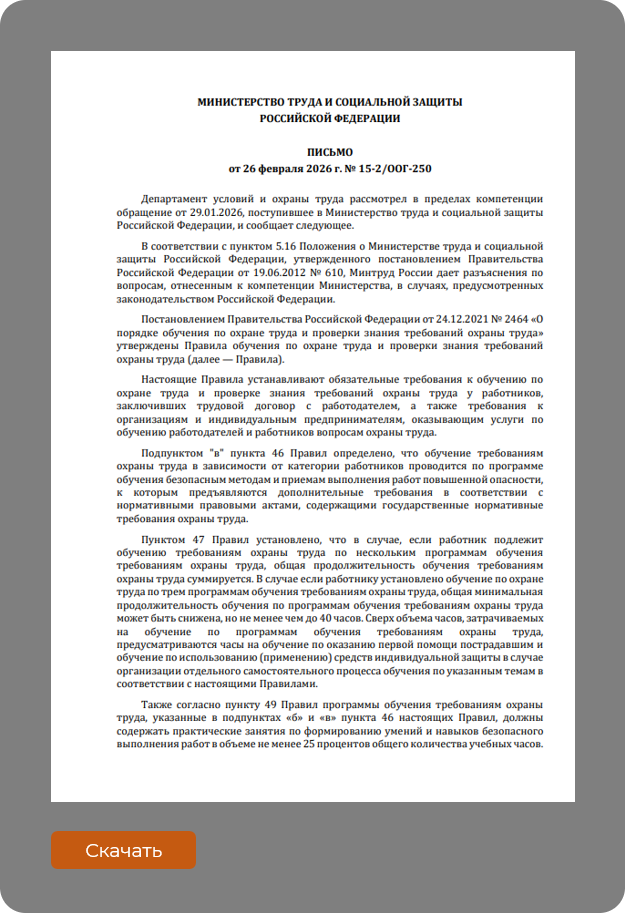 Эксперты Минтруда России в Письме от 26 февраля 2026 года № 15-2/ООГ-250 разъяснили работодателю, что в соответствии с положениями пункта 46 Правил обучения по охране труда, утвержденных Постановлением Правительства Российской Федерации от 24 декабря 2021 года № 2464 (далее — Правила обучения № 2464), является обязательным проведение обучения по программе подготовки безопасным методам и приемам выполнения работ повышенной опасности. В случае, когда работник должен быть подготовлен по нескольким программам, общая продолжительность обучения суммируется. Однако при освоении 3 программ одновременно минимальный суммарный объем может быть сокращен, но не может составлять менее 40 часов (пункт 47 Правил обучения № 2464).