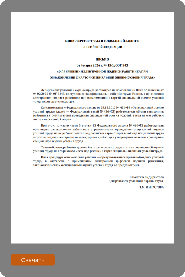 В ответе, изложенном в Письме от 4 марта 2026 года № 15-1/ООГ-303, эксперты Минтруда России разъяснили работодателю, что в соответствии с Федеральным законом от 28 декабря 2013 года № 426-ФЗ «О специальной оценке условий труда» работодатель обязан ознакомить работника с результатами проведения СОУТ на его рабочем месте в письменной форме.