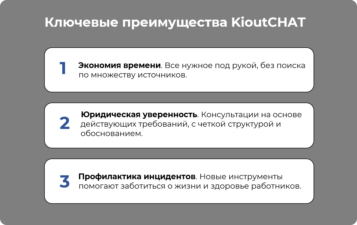 Сегодня специалист в области охраны труда не просто выполняет контрольную функцию, а помогает создавать безопасную рабочую среду, где технологии работают на благо людей. Бумажный документооборот уступает место цифровым решениям, которые анализируют, подсказывают и делают процессы прозрачными. Именно поэтому все больше профессионалов выбирают AI-чат-бот KioutCHAT на базе искусственного интеллекта (далее — ИИ) — не для замены человека, а в качестве надежного партнера, который делает работу проще, точнее и спокойнее.